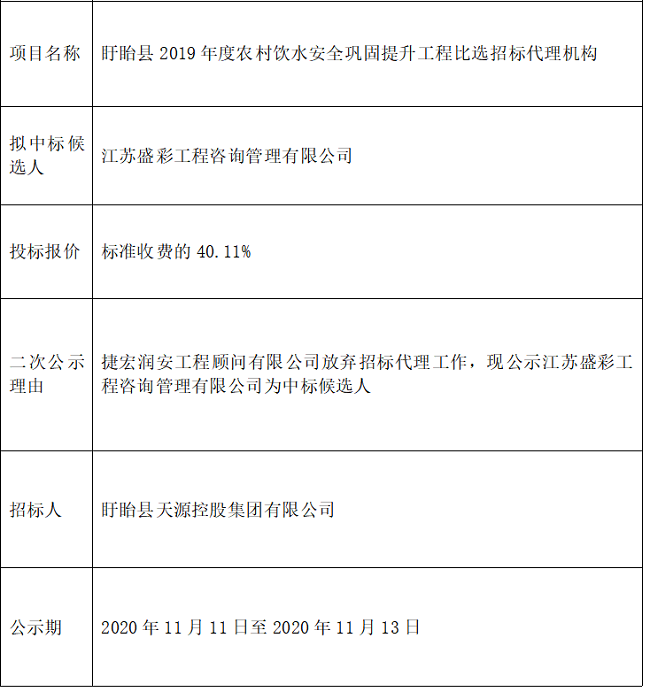 盱眙县2019年度农村饮水安全巩固提升工程中标结果公示(二次)