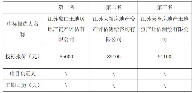 拟确定中标人:江苏象仁土地房地产资产评估有限公司