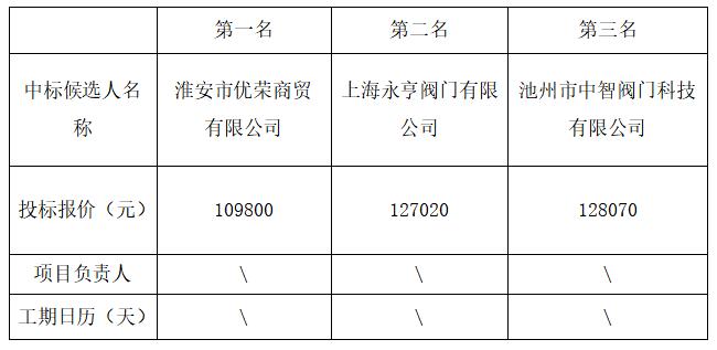 根据工程招标投标的有关法律、法规、规章和该工程招标文件的规定,盱眙县天源永达供水有限公司闸阀计划采购项目的评标工作已经结束,中标候选人已经确定。本项目采用 经评审的最低投标价法 的评标办法,现将中标候选人公示如下: