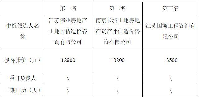 拟确定中标人:江苏伟业房地产土地评估造价咨询有限公司