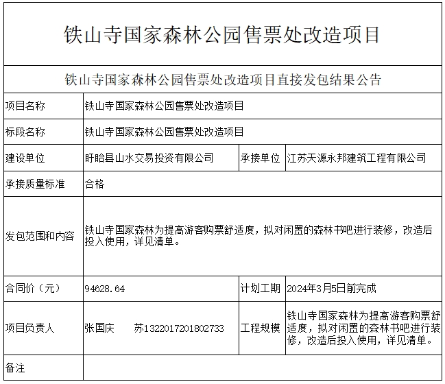铁山寺国家森林公园售票处改造项目直接发包结果公告