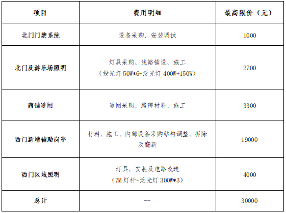 2.项目内容:包含北门门禁系统安装、北门及游乐场照明施工、商铺道闸增设、西门新增辅助岗亭及区域照明改造等。