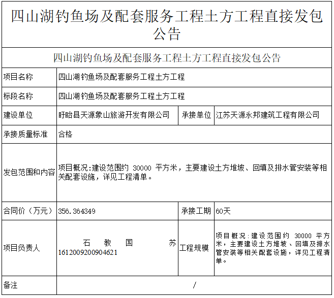 四山湖钓鱼场及配套服务工程土方工程直接发包公告