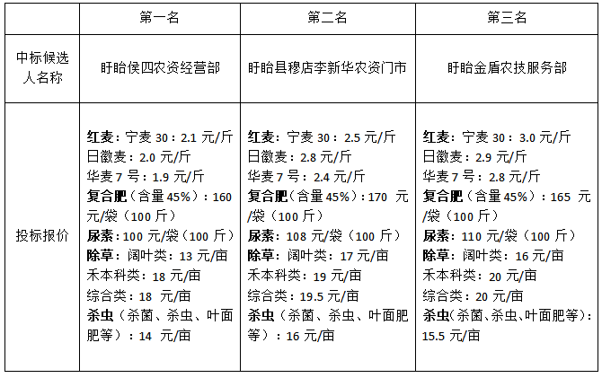 根据招标投标的有关法律、法规、规章和该项目招标文件的规定,盱眙县经济开发区第三批地块种子、化肥等采购项目的评标工作已经结束,中标候选人已经确定。本项目按招标文件上的评标办法,现将中标候选人公示如下:
